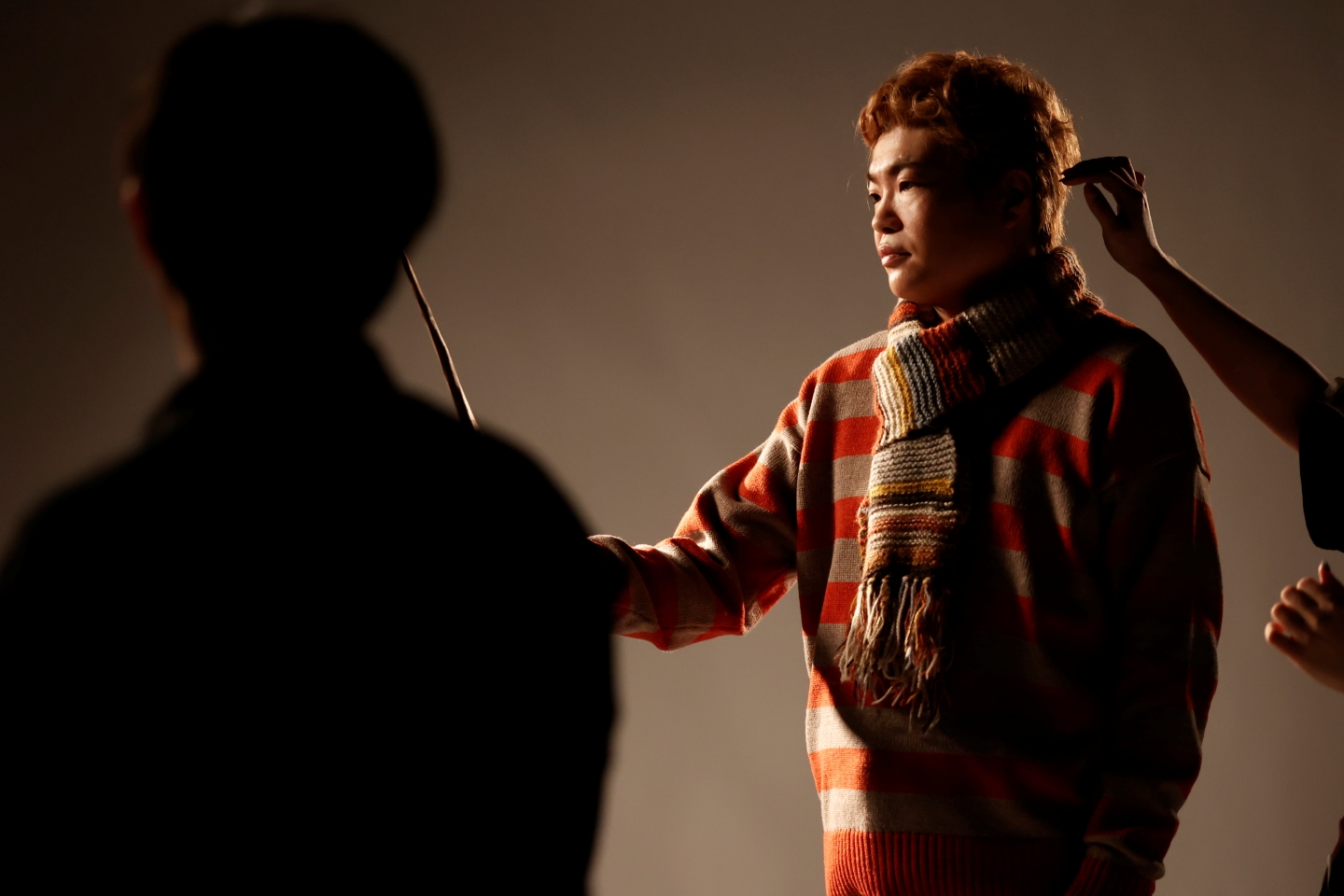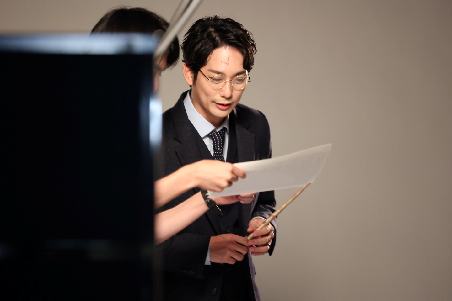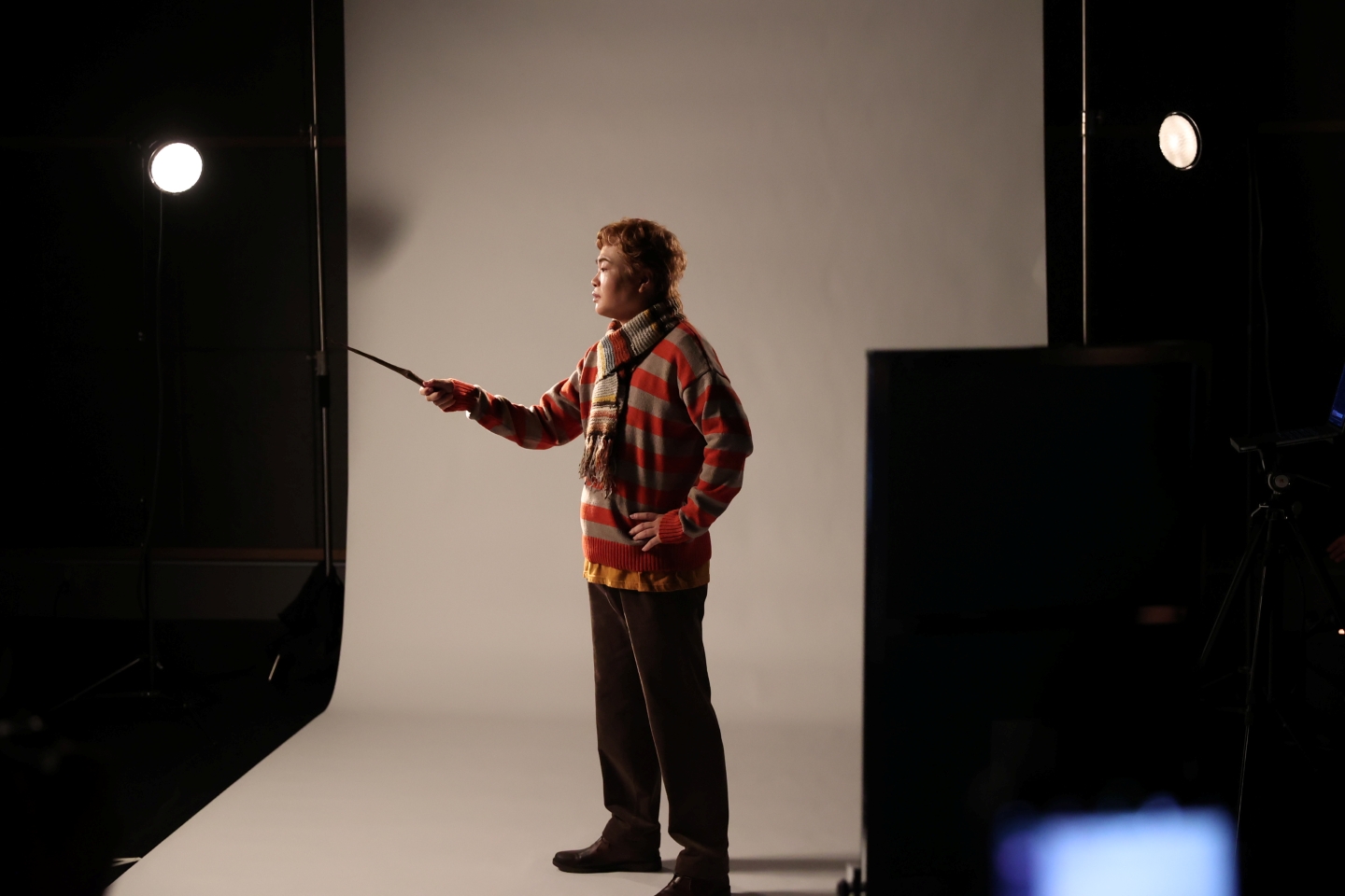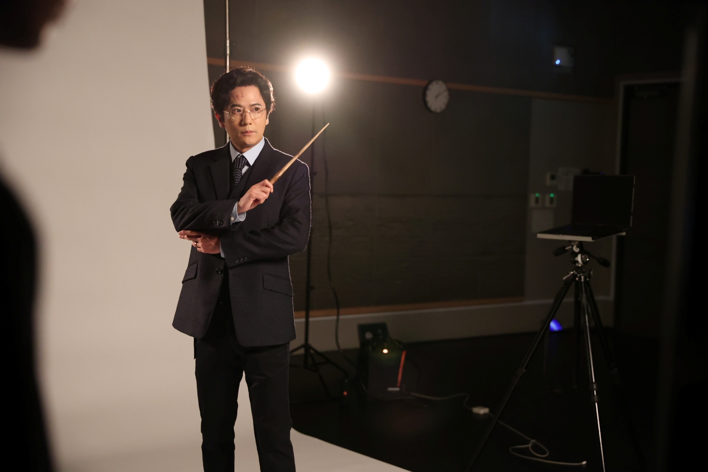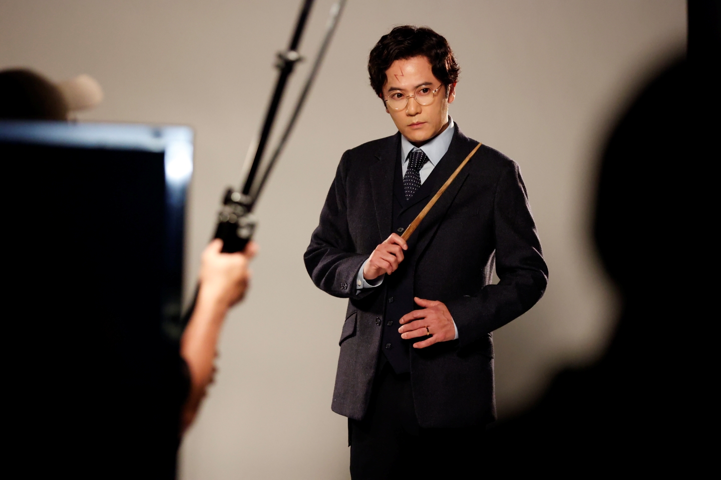 続いてロン・ウィーズリー役の関町知弘。杖を持った撮影では、スタッフが用意したポーズ見本を参考に杖を構え、杖の角度や顔の向きなどを撮影しながら細かく変えていく。「表情に少しドラマをください」と言われて、キリッとした顔に。魔法使いとして大事なアイテムを持ったカットだからか、関町にもスタッフたちにも強いこだわりを感じる。