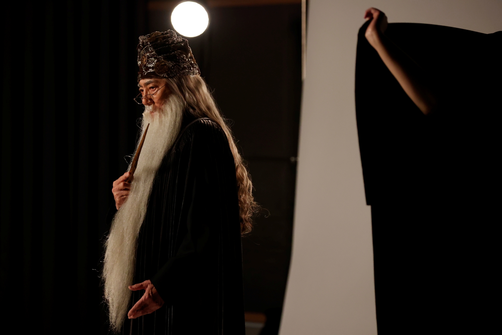 最後に市村正親がダンブルドアの衣裳で撮影。シャッターを切るたびにカメラマンが「カッコいい!」と声を上げる。「杖を少し寝かせると長さが出ます」「表情厳しく」などのリクエストに応えて、市村のポーズや表情が変化。1枚ごとに威厳のあるダンブルドアが出来上がっていった。