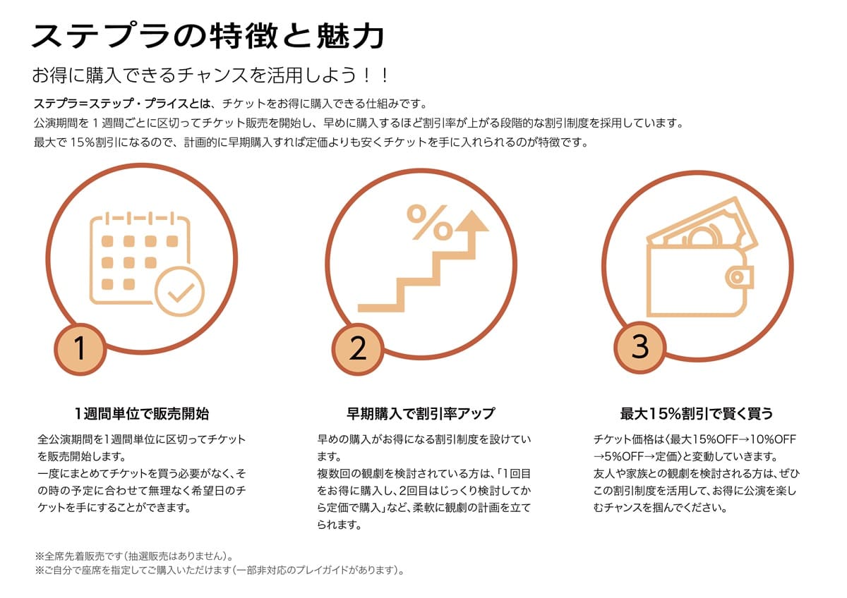 本作では、新たな試みとして新チケット販売システム【ステプラ】(ステップ・プライス)を導入する。これは、公演期間を1週間ごとに区切ってチケット販売を開始し、早く購入するほど割引率が上がる段階的な割引制度だ。最大で15%割引となり、計画的に早期購入すれば定価よりも安くチケットを手に入れることができるのが大きな特徴となっている。