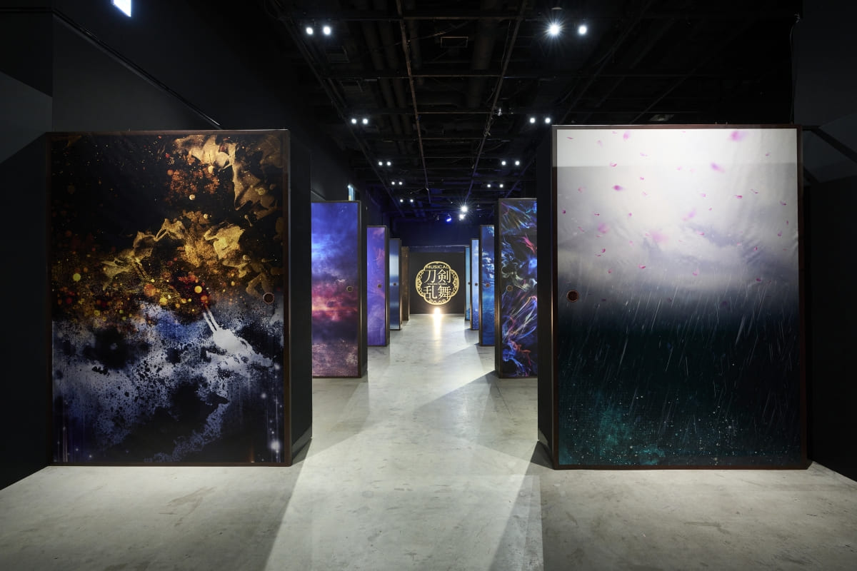 その先へ進むと、過去十年のミュージカル本公演メインビジュアルの意匠を施した襖(ふすま)が並ぶ「襖の間」が広がっている。それぞれの襖の裏には、このために撮りおろした刀剣男士のビジュアルも展示されており、ファン必見の空間だ。