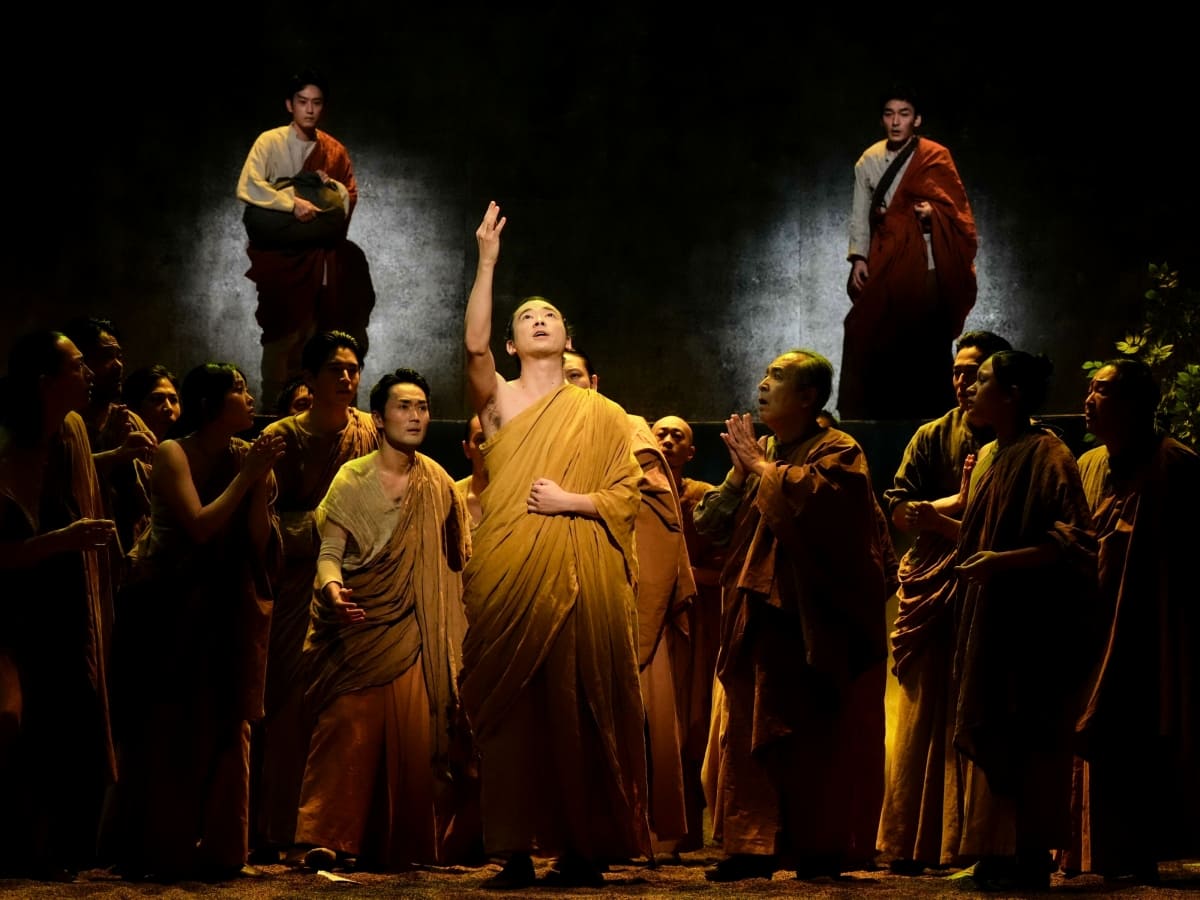 原作はヘルマン・ヘッセの傑作小説。叙事詩的/哲学的な力強い言葉、時空を超えて古代インドに誘われるような音楽、美術・照明・音響さまざまな要素が有機的につながる劇空間――。一人の男の魂の遍歴を描いた壮大な物語が鮮やかに立ち上がった、最終舞台稽古のレポートを送る。