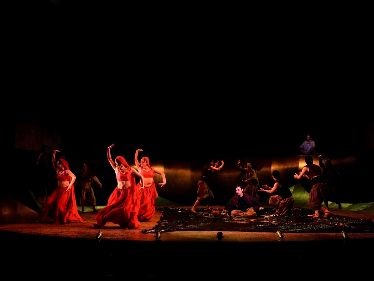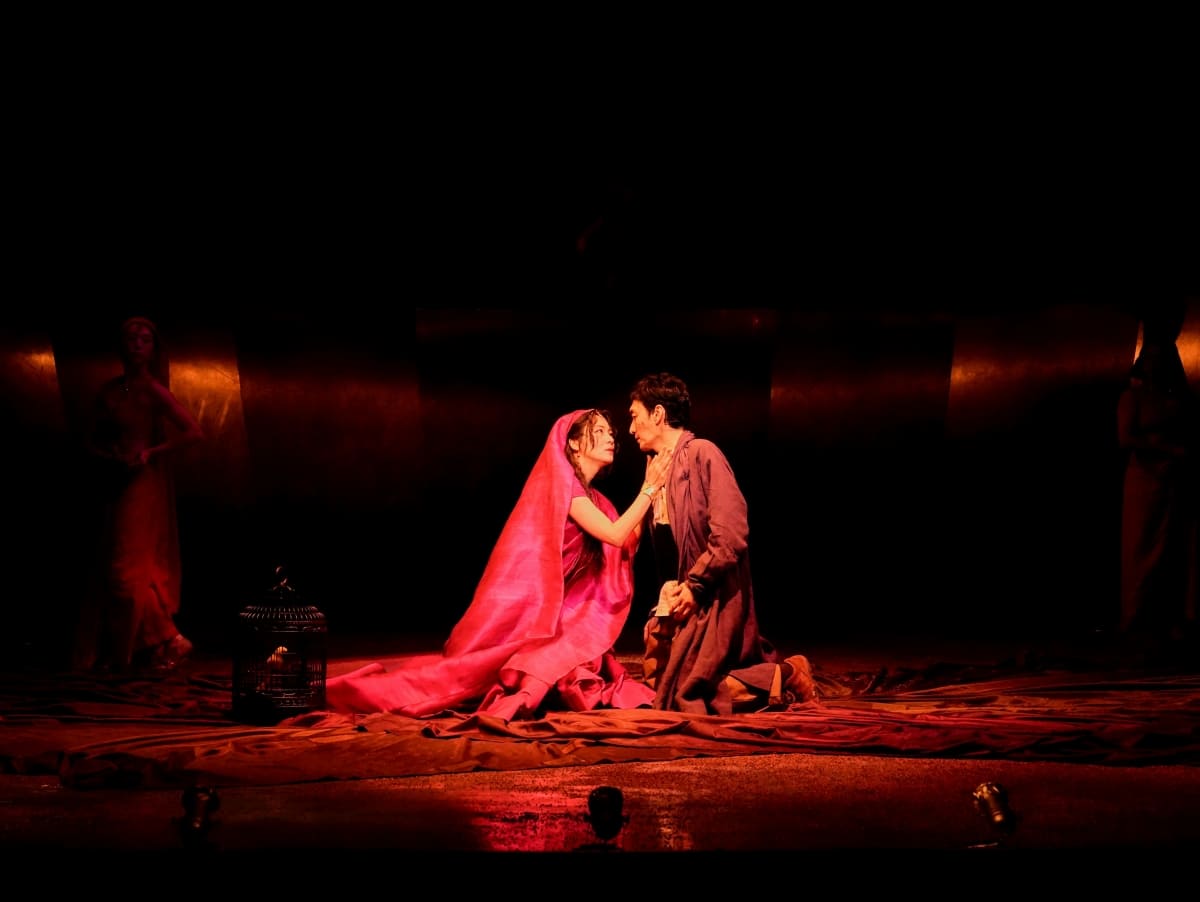 シッダールタが出会いと別れを繰り返しながら旅を続ける物語は、驚くほどにシンプルである。劇場に入ってまず目に入るのは、天井から突き出して光を放つLED照明、大きな穴の中で展開するような舞台美術だろう。役者たちは上段から滑り台のように下段に降りてきたり、一挙に駆け上がったりしながら、自在に舞台を駆け巡りながら演技をする。