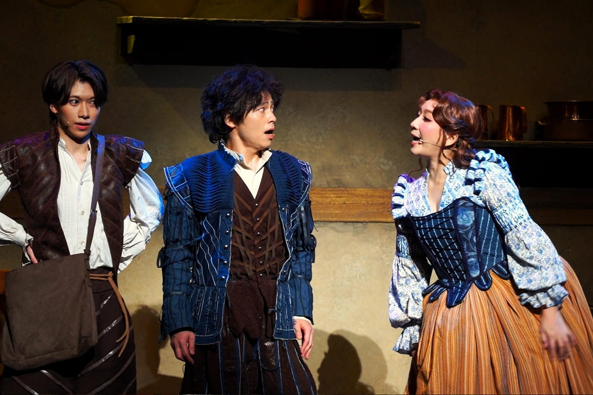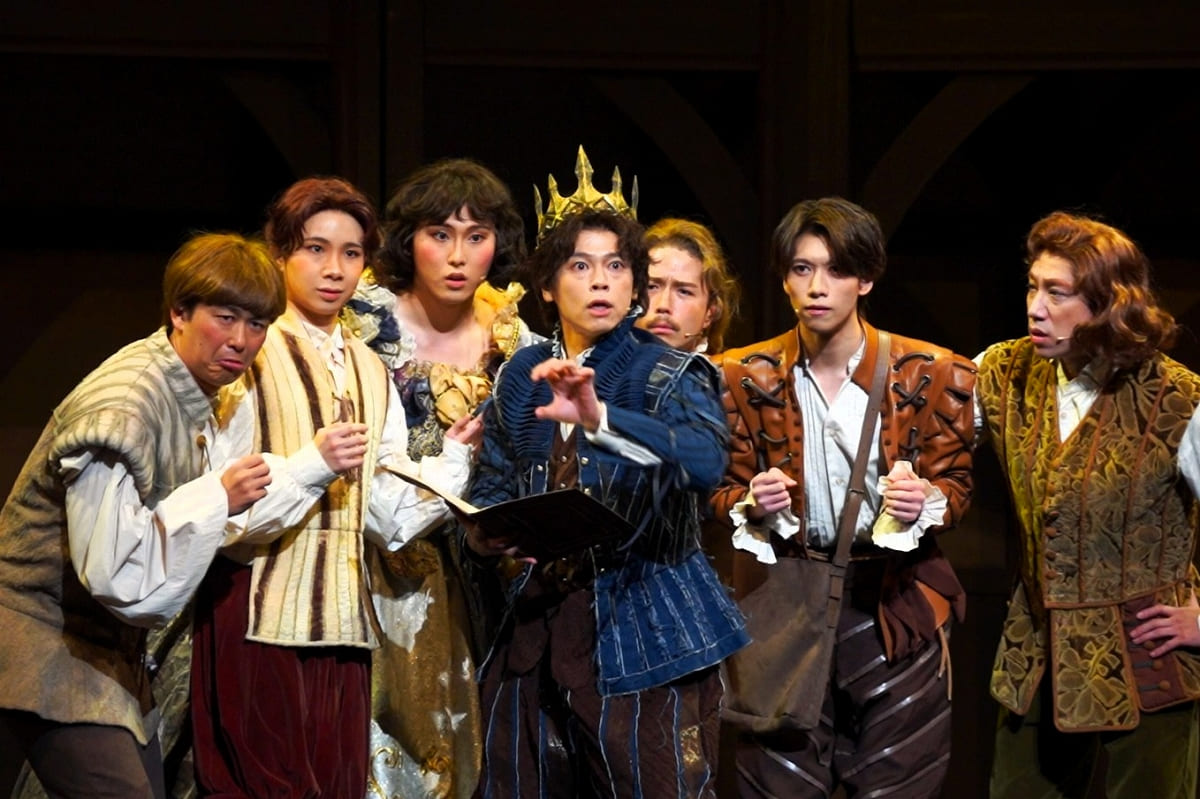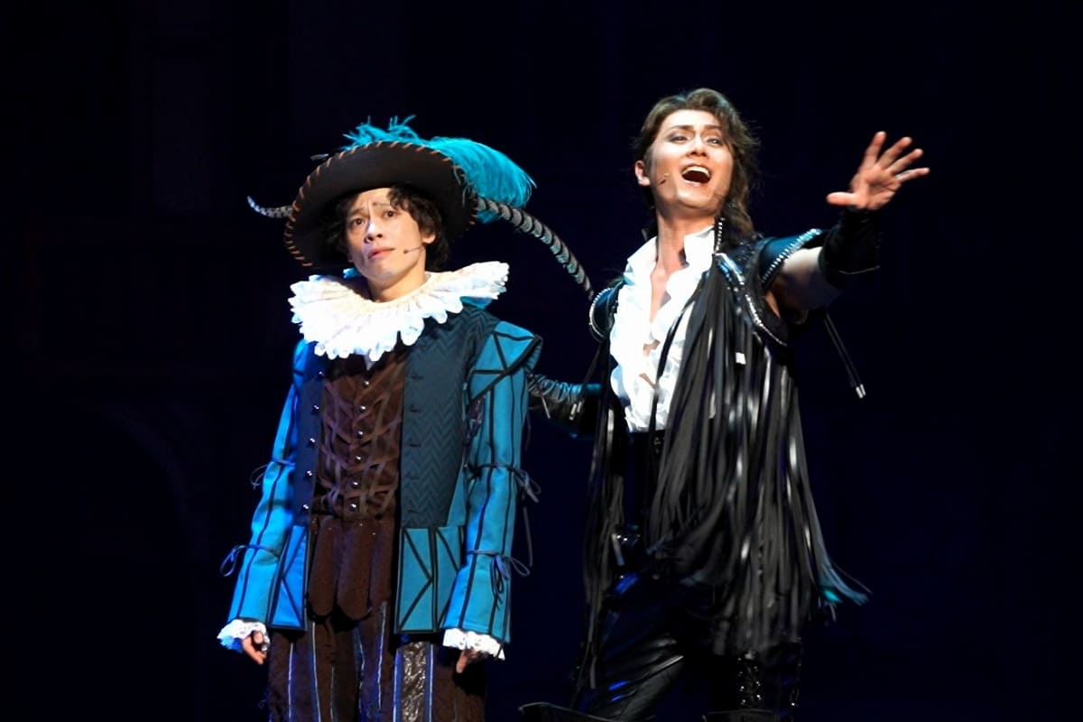 対する加藤和樹のシェイクスピアが登場すると、劇場の空気はさながらライブ会場に!革パンで包んだ長い脚を見せつけ、ウィンク一つで女性たちを失神させる。“ロックスター”としてのシェイクスピア像は、説得力が半端ではない。中川と加藤、タイプの異なる二人の「歌唱力お化け」が対峙するシーンは、火花散るコメディの戦場となっていた。二幕には驚きの変化も待っている。