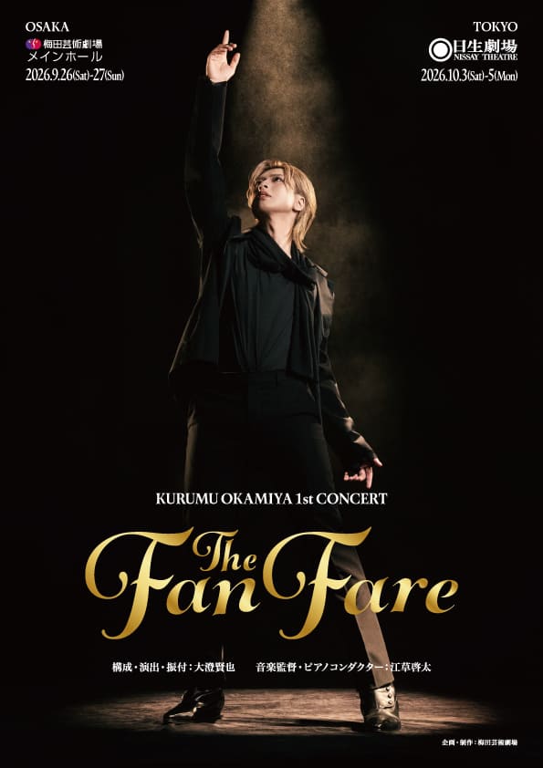 確かな歌唱力と演技力を武器に、数々のミュージカル作品で主演を務める岡宮来夢。彼の初となるソロコンサート、KURUMU OKAMIYA 1st CONCERT『The Fanfare』の上演が決定した。公演は2026年9月に大阪・梅田芸術劇場メインホール、10月に東京・日生劇場にて行われる。