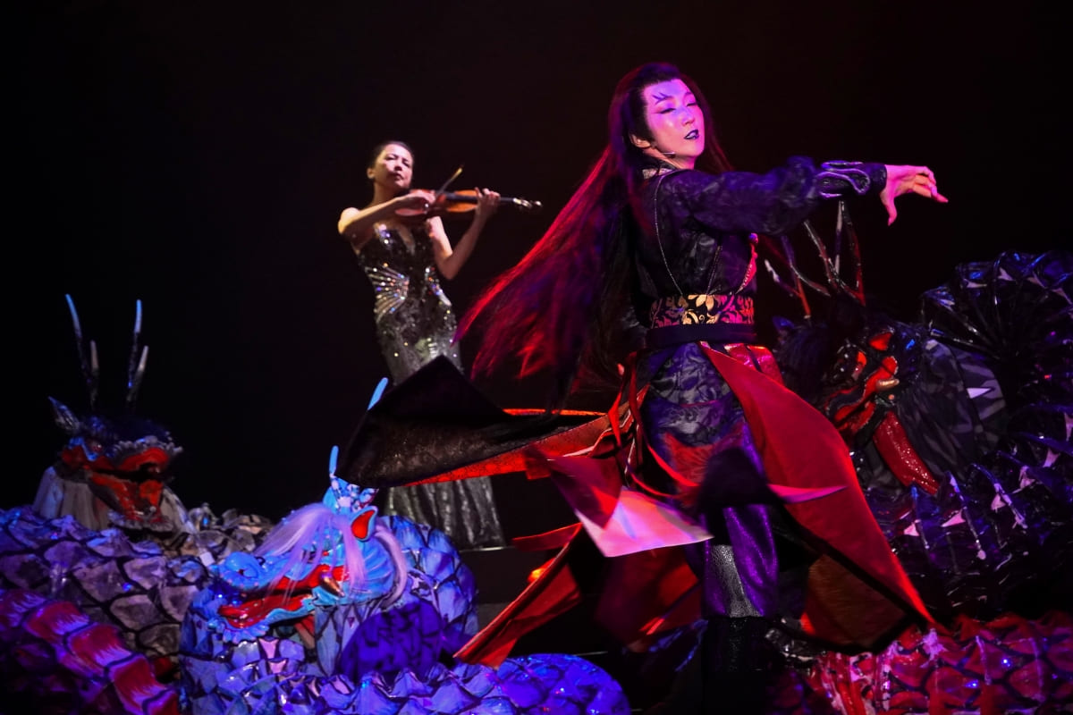 一方、天下った瓊瓊杵尊に袖にされ侮辱を受けた岩長姫は、闇落ちして大蛇に。大蛇となって美しき女性を喰らい尽くす様子を、石見神楽と岩長姫の“大蛇タンゴ”で表現します。そして舞台は、石見神楽のスサノオと尾上右近演じるスサノオが相対し、神とは如何に、人とは如何にと問う、“二人スサノオ”の場面へ。