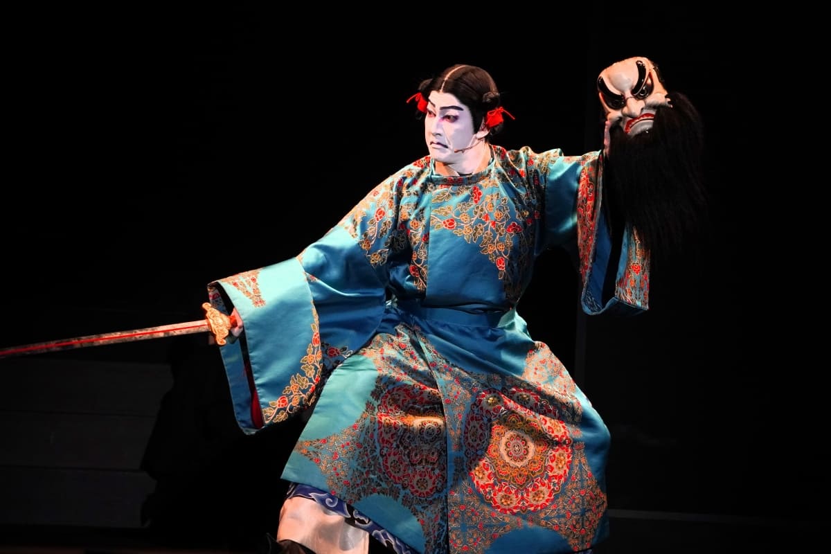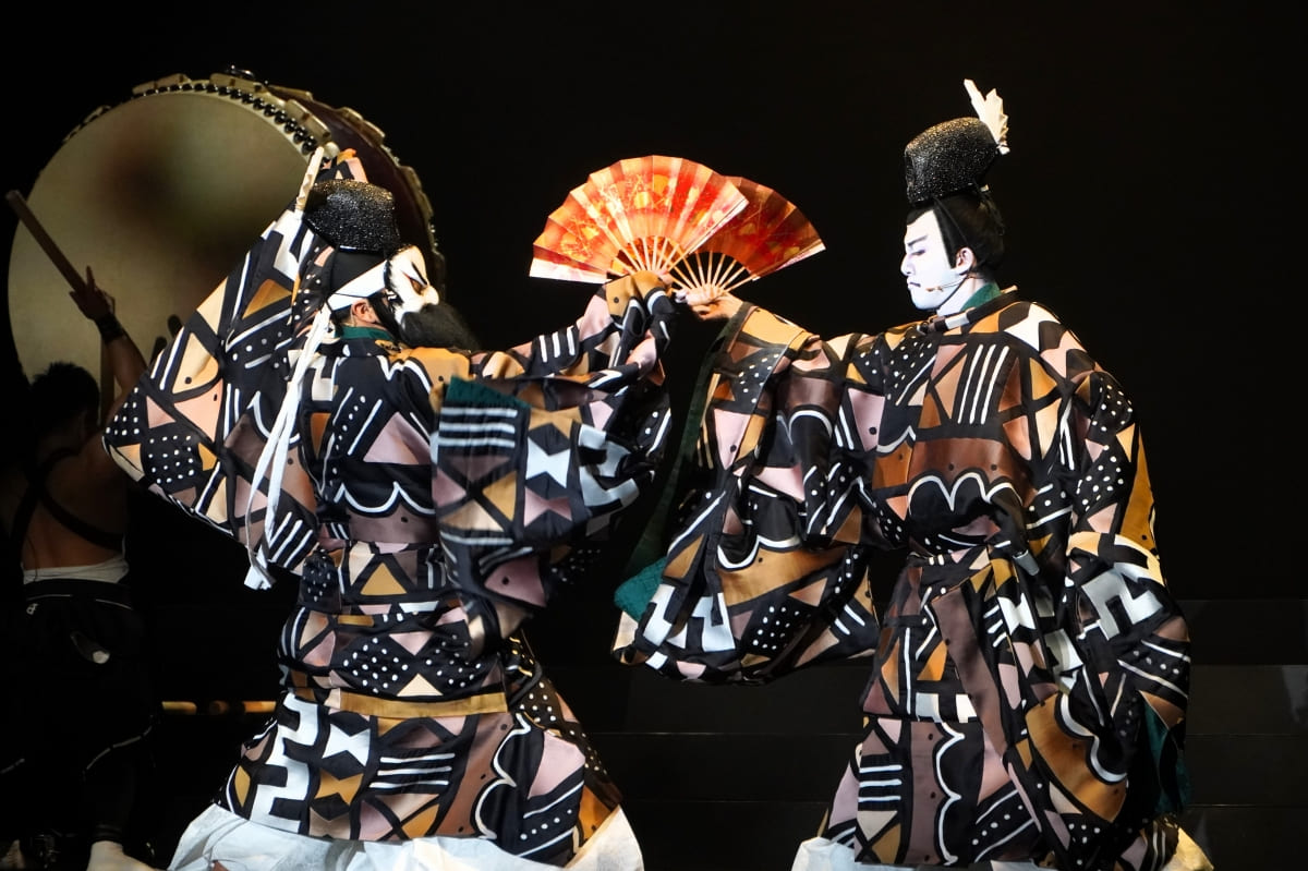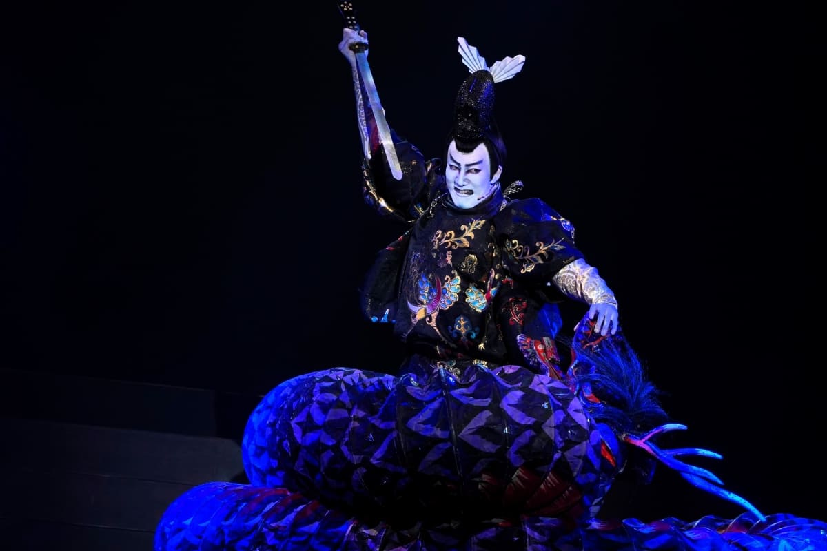 そして、イザナキとイザナミの国生み、神産みを描いてゆく神秘的な幕開けより、黄泉へと去った母イザナミの穢れを濯いで生まれたスサノオが、舞台上で衣裳を纏い、隈を取り、大太刀を持って歌舞伎の荒事を見せ、荒む魂、荒御魂を現して天上へと踊り込みます。
