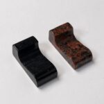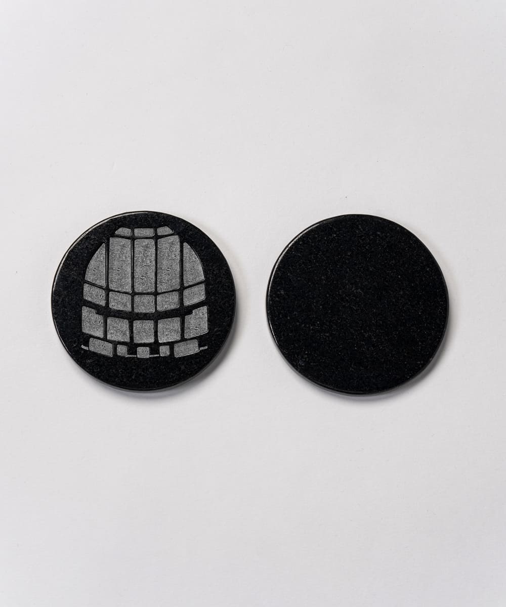 1966年の開場当初からロビーを見つめてきたスウェーデン産のインペリアルレッドとブラックスエード。今では産出されないこの貴重な自然石からは、箸置きやコースターが。さらに、ロビー壁のレンガや入口のガラス扉の欠片もミックスしたテラゾーテーブルも制作された。