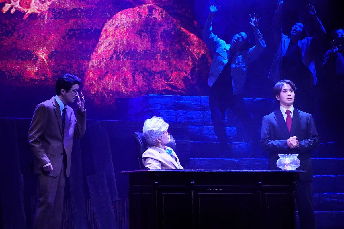 演出の中屋敷法仁が仕掛けたのは、最新の映像技術と、演劇ならではの「人力(アナログ)」の融合だ。会見でも話題に上ったアンサンブルキャストの活躍が光る。不気味で統率の取れた動きながら、生身の人間だからこそできる表現がそこかしこに散りばめられていた。