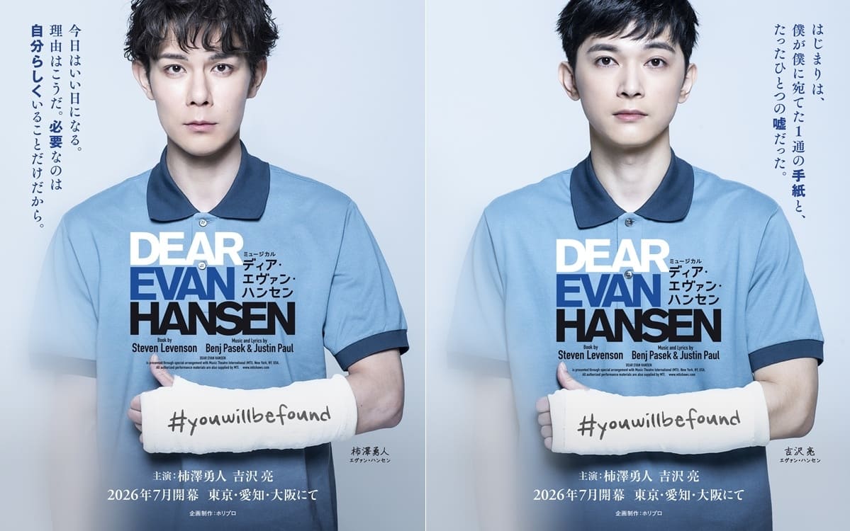公開されたビジュアルでは、主人公エヴァン・ハンセンをWキャストで演じる柿澤勇人と吉沢亮が、作品の象徴とも言える青いポロシャツに腕のギプス姿で登場。「#youwillbefound」と書かれたギプスを抱え、どこか寂しげでありながらも真っ直ぐな視線を向ける姿が印象的だ。
