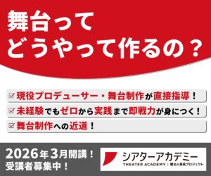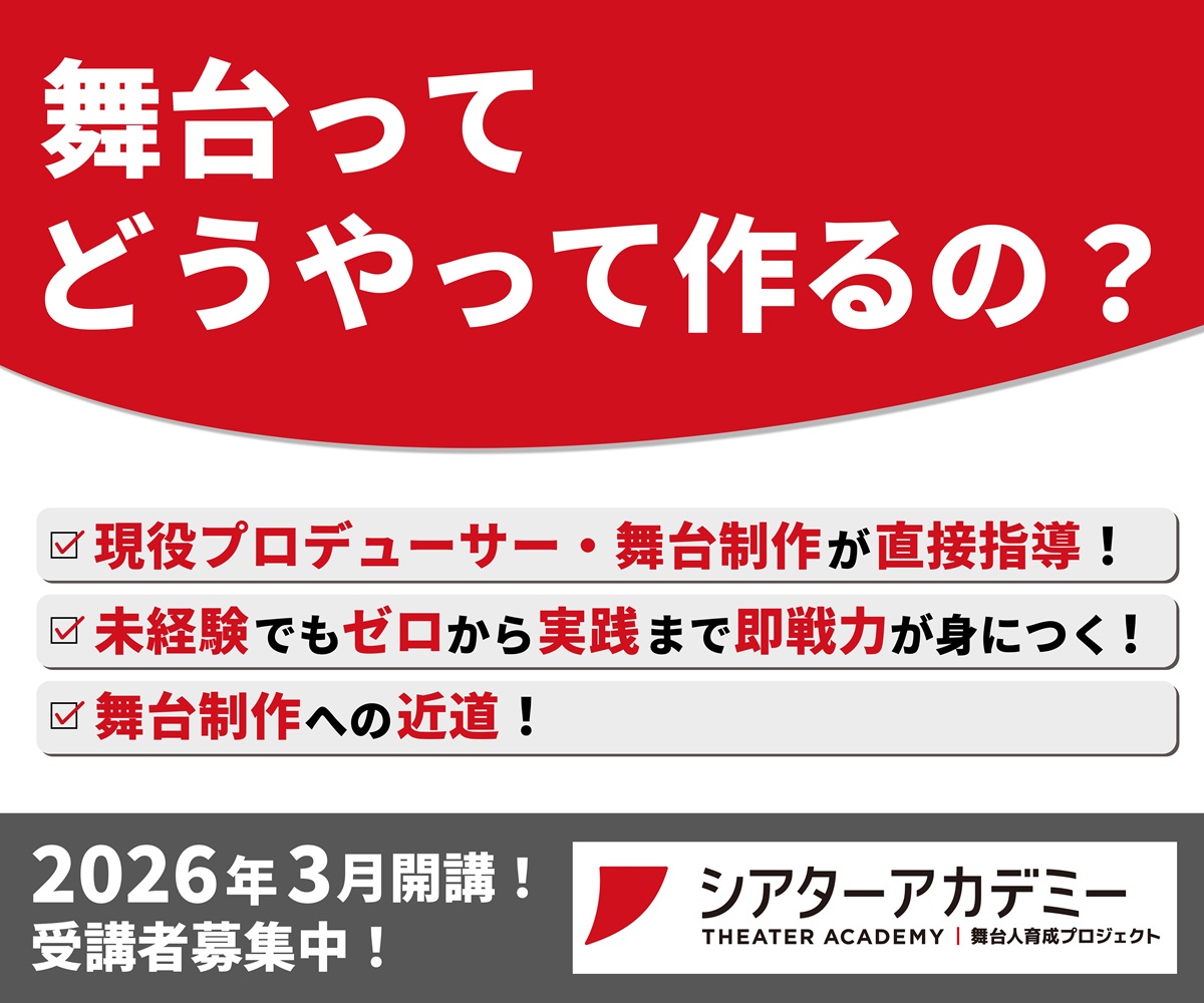 | 第7回 | テーマ:制作の仕事 <地方公演>編 2026年3月25日(水) 19:30〜 次は地方公演! 現場ごとに様々なスタイルの地方公演があり、地方公演ならではの下準備も、ここで身につけよう。 |