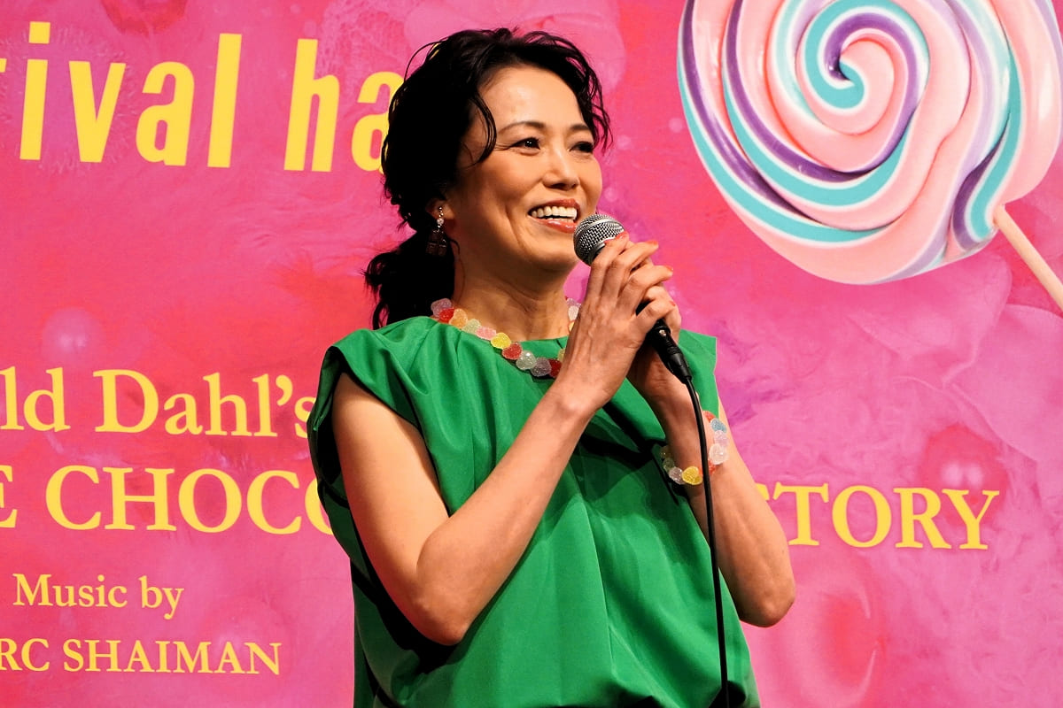 グループ夫人役の鈴木も、ジョージナおばあちゃんを兼役でやりつつ、「前回、袖から光一さん演じるウォンカとチャーリーたちの歌をいっぱい聴いて、毎回胸が熱くなって涙していました。再演はもっとバージョンアップするということで、今からまたウォンカのチョコレート工場見学ができることを楽しみにしております。新しい子役の子たちと、食べて食べて食べて食べて!ハングリーにがんばりたいと思います!」と意気込んだ。
